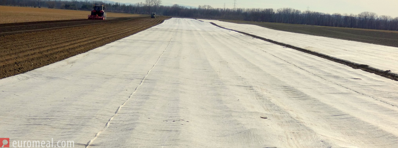 Das Aufbringen des Flieses ist wieder Handarbeit. Es wird mit dem Traktor entlang der Felder ausgelegt, dann über das Felder gezogen. Ein kleines Stück Flies daheim im Garten auszulegen, ist nicht schwer. Die Größe mit der wir es hier zu tun haben, macht das nicht so einfach und es ist manpower dazu notwendig um das zu Bewerkstelligen. Es sollte möglichst windstill sein, das erleichtert das Auslegen. Damit damit der Wind das Flies nicht verweht und es schön gespannt, wird es rundum Erde angehäuft und fixiert. Es ist zwar sehr filigran, und doch kann mehrere Saisonen verwendet werden. Den größten Schaden richten Wildtiere beim darüber laufen an, die Löcher hinein reißen.