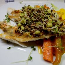 Wurzelgemüse Curry mit gebratenem Zander und Microgreens