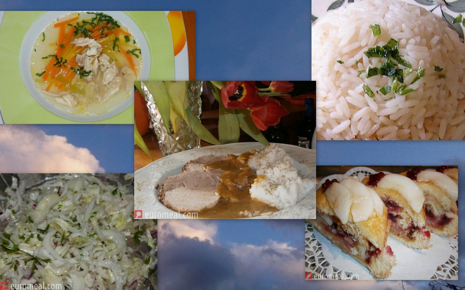 Als ersten Gang gibt es eine Hühnersuppe mit Gemüse und Fleischeinlage. Wie wäre es mit einem Schweinsbraten als Hauptgericht? Aber nicht dem klassischen Schweinsbraten, sondern einem japanischen Schweinsbraten mit Senf und Gemüse in einer gebunden Sauce. Dazu passt gedünsteter Reis und Chinakohlsalat. Als Nachspeise gibt es eine Biskuitroulade mit saftiger Apfel, Preiselbeerfüllung, die ist ganz schnell gemacht und ein krönender Abschluss für dieses Menü.