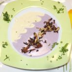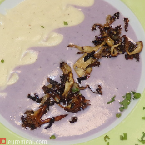 Potatoes are available in different color variations. The colorful potatoe soup is prepared from the usual yellow and the more exotic purple potatoe. The colors are seperately processed into soups and combined on the soup plate. Mushrooms go well with potatoe dishes, so there are fried morels as inlay. This recipe is very simple and offers a festive soup that children can use to surprise Mom on Mother's Day.