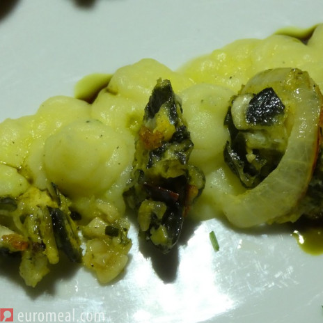 Wash the potatoes, peel and cut them into pieces. Boil them in salt water. Drain the water and place it aside. Peel the pumpkin and rip it with the grater. Peel the garlic, cut and chop it finely. Heat the milk. Add the pumpkin rasps and the garlic to the potatoes, add some boiling water and crush everything with the masher. Add the milk and butter and stir thoroughly using a whisk.