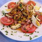 Die Eier schälen und in Viertel schneiden, die Paradeiser in Scheiben schneiden. Den Wurstsalat in Schüsseln oder auf einem Teller anrichten und mit Ei und Paradeisern garniert servieren.