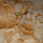 Mit dem Brotmesser die Semmeln in dünne Blätter und in Würfel schneiden.