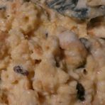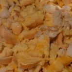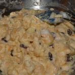 Butter in der Pfanne erhitzen, sie soll aber nicht bräunen. Die Semmelstücke in eine Schüssel geben und mit der Ei-Milch übergießen. Die Rosinen zugeben und anziehen lassen.