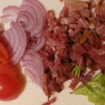 Peel the onion and cut it into strips. Wash and slice the tomato and peppers. Cut the bacon into cubes.