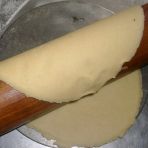 Sprinkle a worktop with some flour. Roll out the dough until it's five millimeters thick. Fold it with the pie pallet so that the dough won't stick to the surface. Place it with the help of a rolling pin into the prepared cake pan.