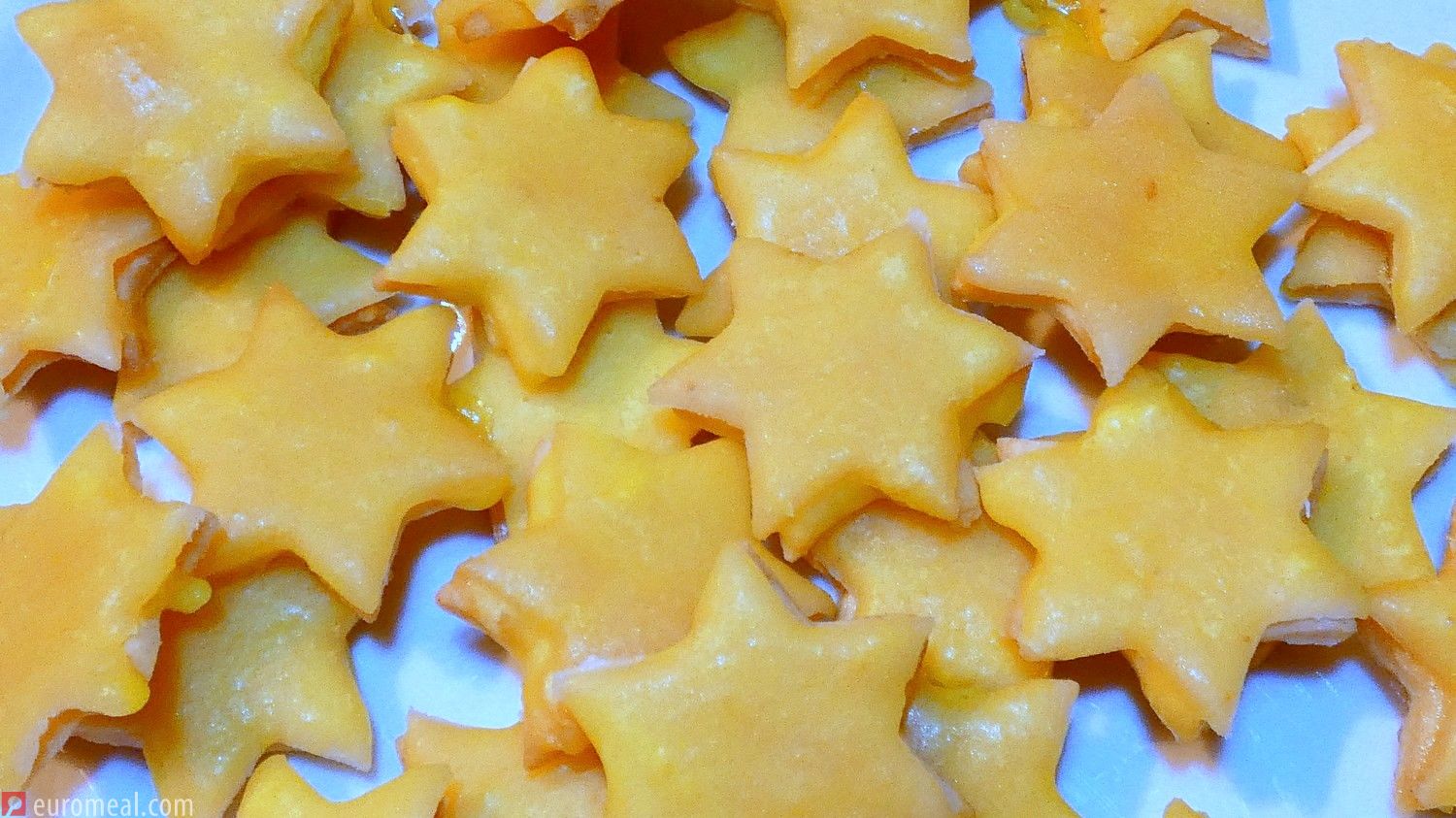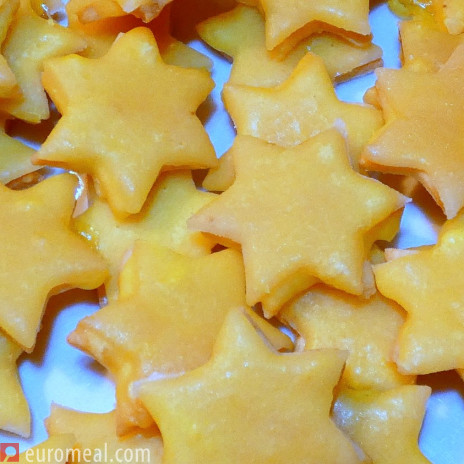 Shortcrust biscuits with marzipan topping, orange marmalade and orange icing. The recipe requires some patience, but they taste great. When kept cool and dry in cookie jars, they will stay fresh for about six weeks.