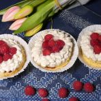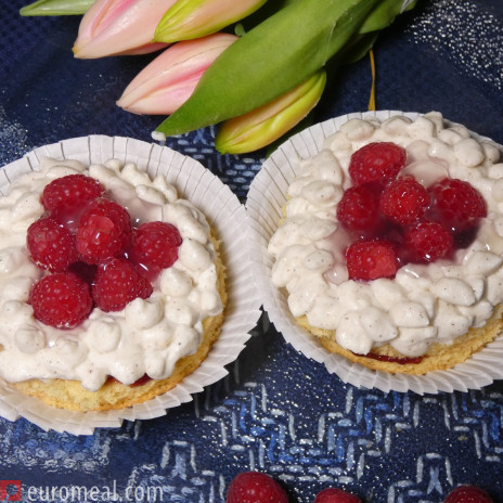 A fruity raspberry heart surrounded by sweet vanilla cream. This recipe is easy and fast to prepare, so it's very suitable for beginners and children. If you do not want to bake sponge cake, you can also use ready-made biscuit.