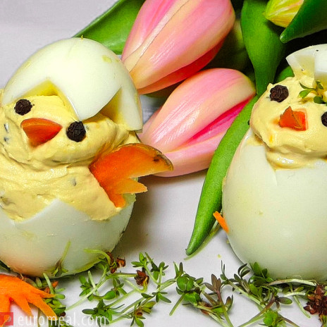 What to do with all those colorful Easter eggs? It's a great idea to prepare stuffed eggs for Easter brunch, Easter snack, or as a cold appetizer for the festive Easter dinner. In this recipe, they are sliced horizontally, filled with a cream made from the removed yolk and mayonnaise, and then nicely garnished in the shape of an Easter chick with carrot pieces. My guests always find them almost too cute to eat.