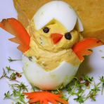 Chill the egg chicks until ready to serve. As a garnish, sprouts of cress are suitable, and they can be served with bread or pastries.