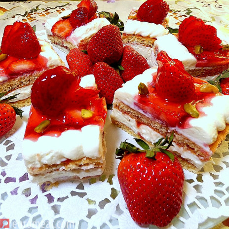 Strawberries are very popular fruit. Their red color and flavour sweeten the spring. They are often used for desserts. These strawberry slices are easy to bake. All those who are in a hurry can also use ready-made biscuit bottoms. They are filled with cream of curd, sugar and cream, topped with strawberries and covered with red jelly. It fits as a dessert, for afternoon coffee, for every celebration and especially for Mother's Day.