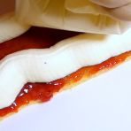 Place the second biscuit strip with the jam side down on the cream, press gently and spread the edge using a spatula.