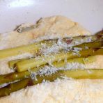 Pour the dough into the pan and let it set slowly. The omelete can be covered with a lid for about five minutes. Put the asparagus on top of the omelet and spread the parmesan over it.