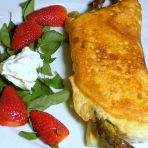 The asparagus omelettei be prepared very easily and quickly. This light egg-dish suits many occasions. The cooked asparagus is added to the ham omelette. Grated Parmesan causes it to be even tastier.