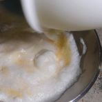 Beat the egg white with the whisk until it's a firm and creamy snow. Use the dough card to lift the snow under the egg mass.