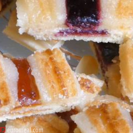 Railroaders should not be missed on any pastry plate. In this recipe, two shortcrust pastry strips are put together with jam. On the top, two strips of marzipan dough and jam are decorated. Dried overnight, the marzipan is baked with top heat and browned. Finally, they are cut into small strips before serving.