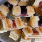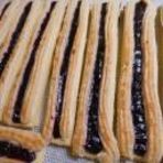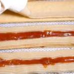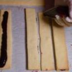 Stir the jam until it's smooth and bring it to a boil in the microwave. Pour it into a disposable injection bag and apply it to half of the baked strips. Put a second strip on it and press firmly.