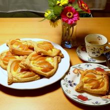 Warm the milk slightly and melt the butter in it. Separate one egg into yolk and egg white; the leftover egg white will be used for brushing the dough pieces. Crack open the second egg, add it entirely, and whisk it with a fork.