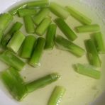 Peel the asparagus, cut off the ends and cut it into small pieces. Cook it in water with salt and a teaspoon of vinegar. Strain it and allow to cool slightly.