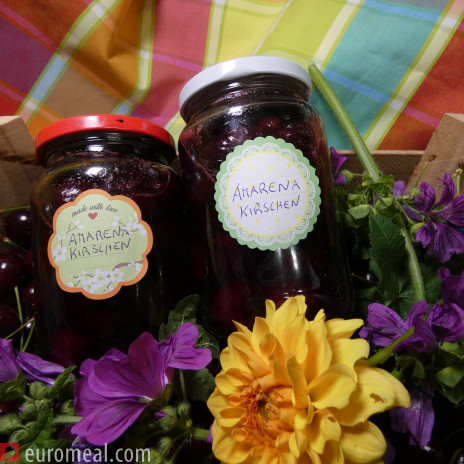 Amarena cherries are a specialty which is known from Italy. First, the cherries are sugared, then they are left to steep and finally, they are cooked. The syrup is refined with amaretto, which is an almond liqueur. The cherries are poured into sterilized jars whilst they are boiling. It is very easily prepared. These homemade Amarena cherries taste particularly good in cakes, tarts and of course with ice cream.
