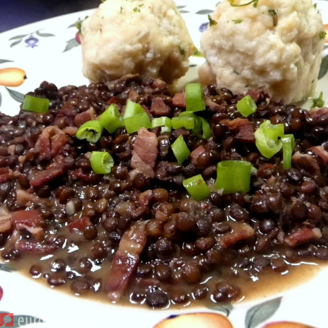 Dried belug lenses can be quickly and easily processed into delicious dishes. These black lentils have the property that they hardly need to be soaked or not at all before cooking. Fried bacon gives this delicious lentil dish even more flavor. You can also pre-cook it well and then reheat it.