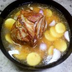 Peel the potatoes and onions, cut the onion into large wedges, and cut the potatoes into thick slices. After 50 minutes, take the roast out of the oven and place the potatoes and onions in the juice.