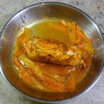Banana filled, slowly fried all around in the pan, then brushed with the mixture of curry, garlic, pepper, paprika, salt, chili powder and honey and braised in the oven together with strips of vegetables. The sprouts are briefly tossed in oil so they are also hot and served with the roulade.