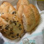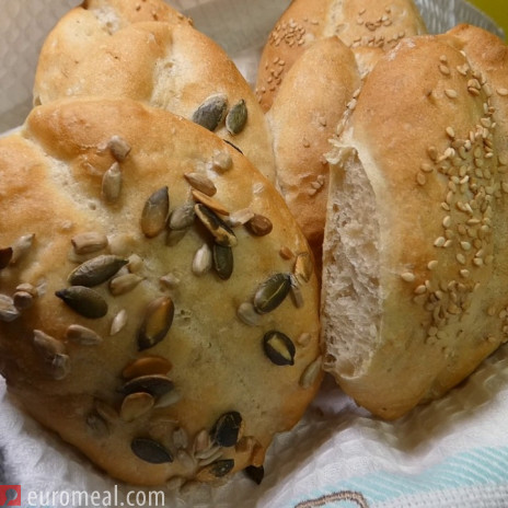 Bring water to a boil in a saucepan and place it in the oven. Preheat the oven to 220°C convection. Turn the pastries over, brush them with water and sprinkle them with grains or seeds of your choice. Bake them on the lower shelf for about 25 to 30 minutes until they turn out golden brown. Remove the rolls from the oven and brush them with a little water whilst they are still hot.