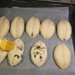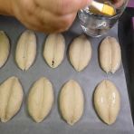 Place the pastries faceing down on the bakeing tray. This way, the notch will remain even after your pastry has risen. Brush them with water, cover them using a cloth and let them rise again for about 30 minutes.