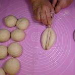 Form the balls into rolls, sprinkle them with flour and add notches in the middle.