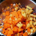 Add the pumpkin and potato cubes to the stew and simmer until the potatoes are soft to the bite.