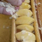 Apples and marzipan complete each other wonderfully. The marzipan is not only used as a decoration, but also incorporated into the batter. The apples are pre-steamed with cinnamon and sugar and then draped onto the slices. This dessert tastes very juicy.