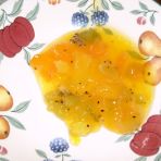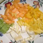 Cut all the fruits into small pieces on a porcelain- or glass plate.