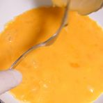 Carefully remove the egg from the edge and stir gently. It should be heated slowly. Avoid frying! The consistency should be creamy, otherwise it is too dry and does won't taste s good.