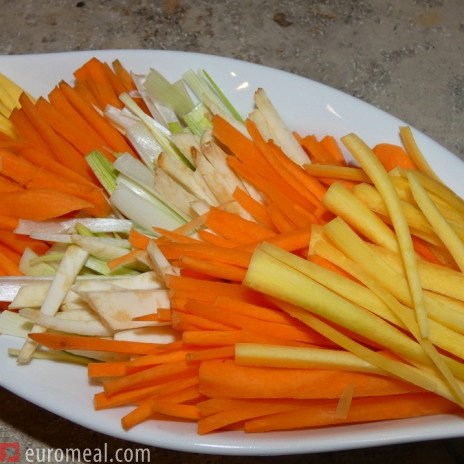 The term "Julienne" specifies a basic cutting technique. Here, vegetables are cut into evenly rods.