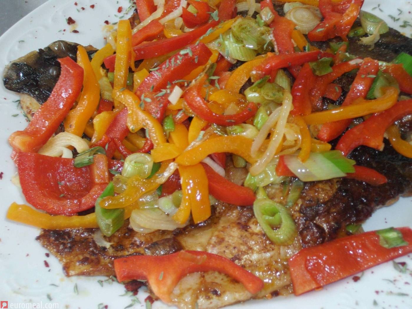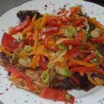 Olivenöl in einer Pfanne erhitzen. Die fein geschnittenen Paprikaringe darin anbraten, salzen und pfeffern.